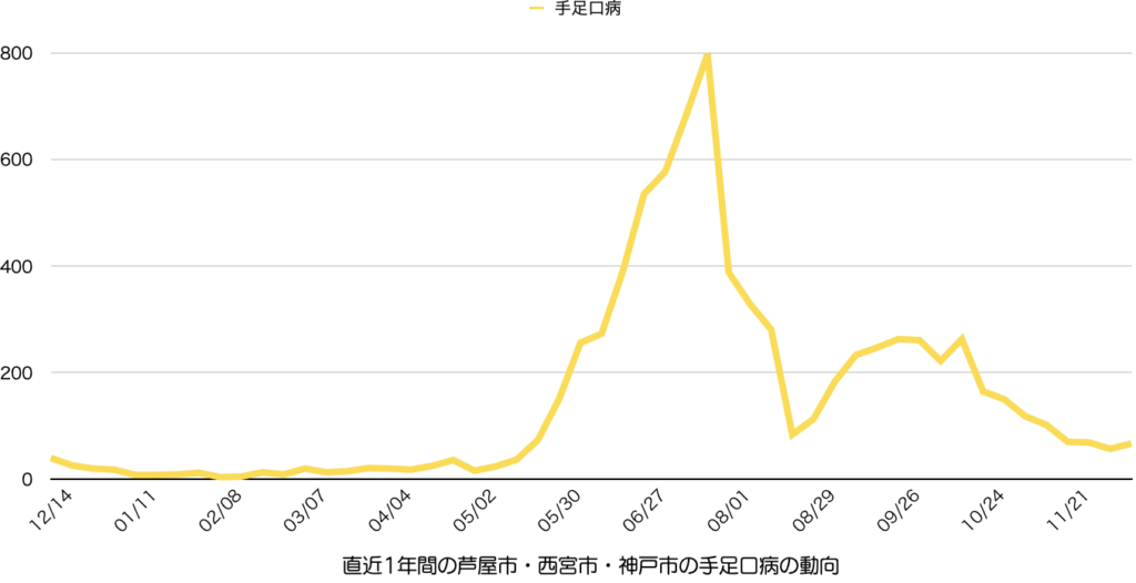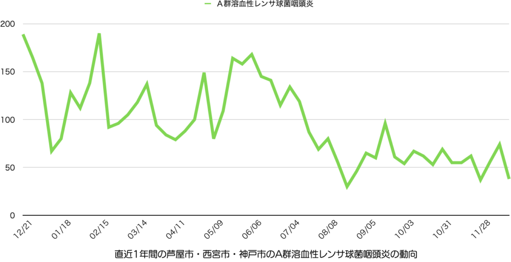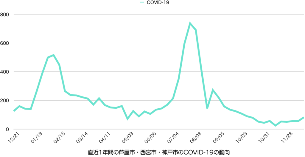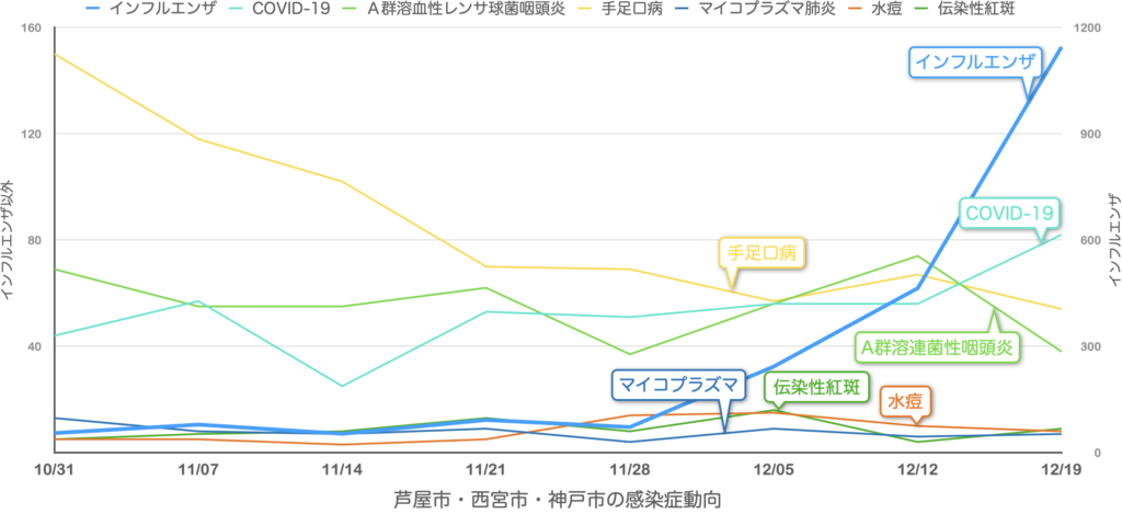 兵庫県感染症情報センターからリリースされている週報から芦屋市・西宮市・神戸市の情報をピックアップして集計したものを若干のコメントをつけて配信しています。