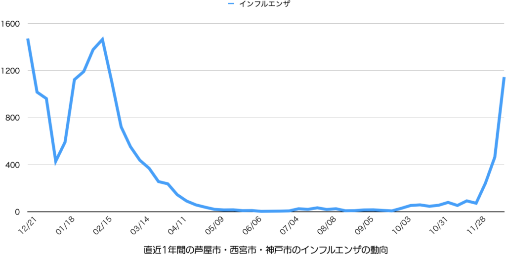 COVID-19は過去1年間における最小レベルで推移中ですが、11/14を最小として緩徐に増加傾向を呈しつつあり、兵庫県ではインフルエンザ・感染性胃腸炎に次ぐ報告数に達しています。