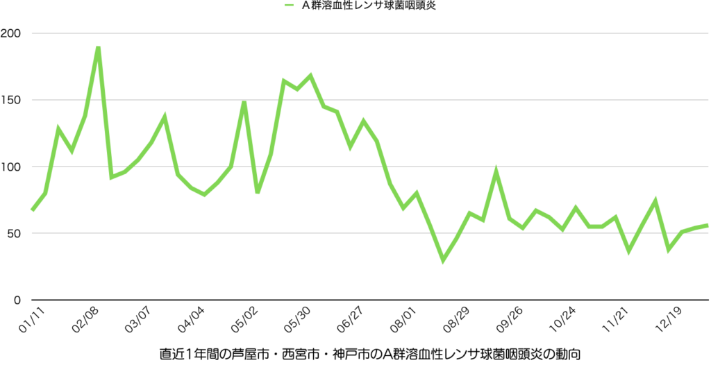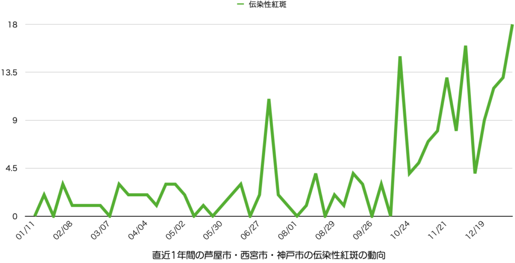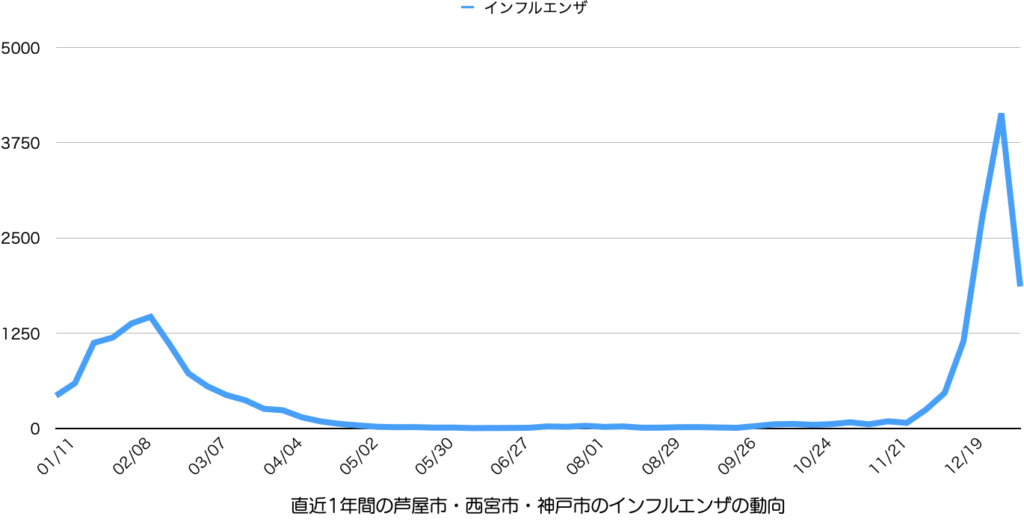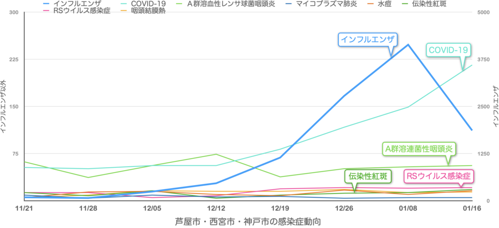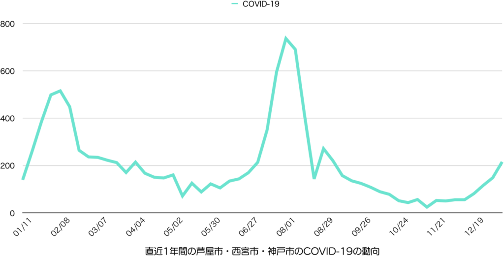 兵庫県感染症情報センターからリリースされている週報から芦屋市・西宮市・神戸市の情報をピックアップして集計したものを若干のコメントをつけて配信しています。