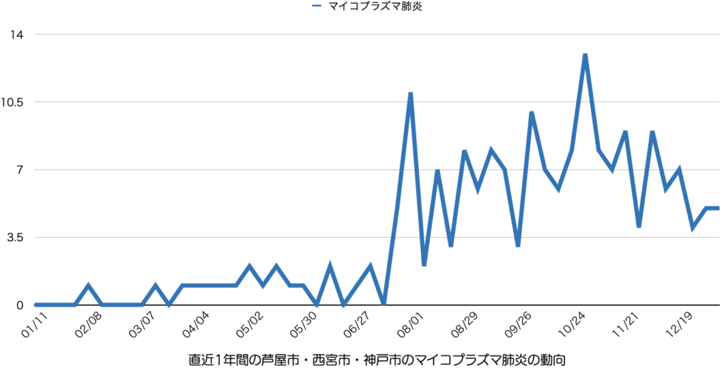 マイコプラズマ肺炎は短期的に増減を繰り返しており把握が難しいところがありますが、明確に減少傾向へ転じたとは言えない状況が続いています。