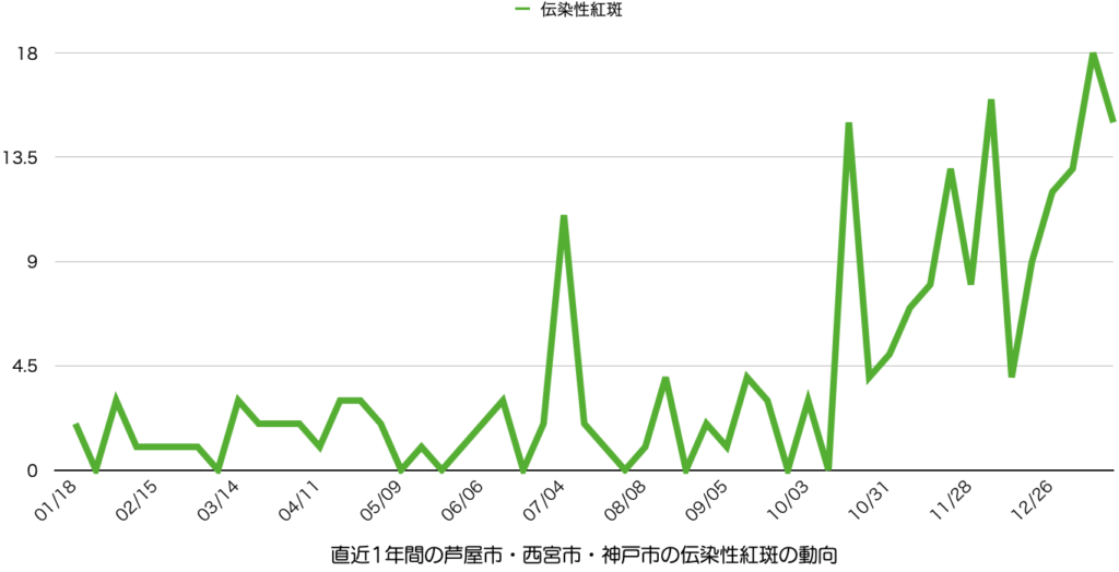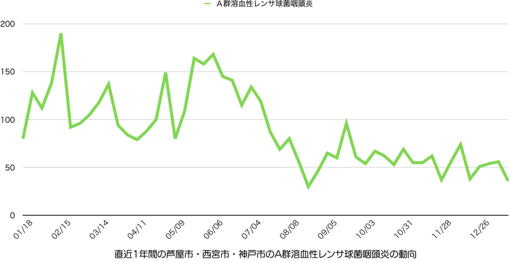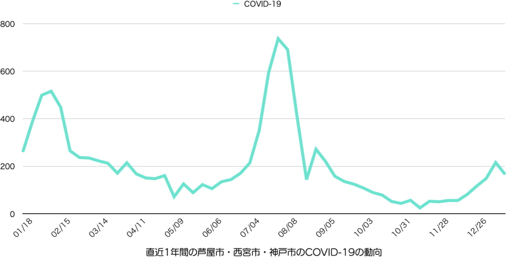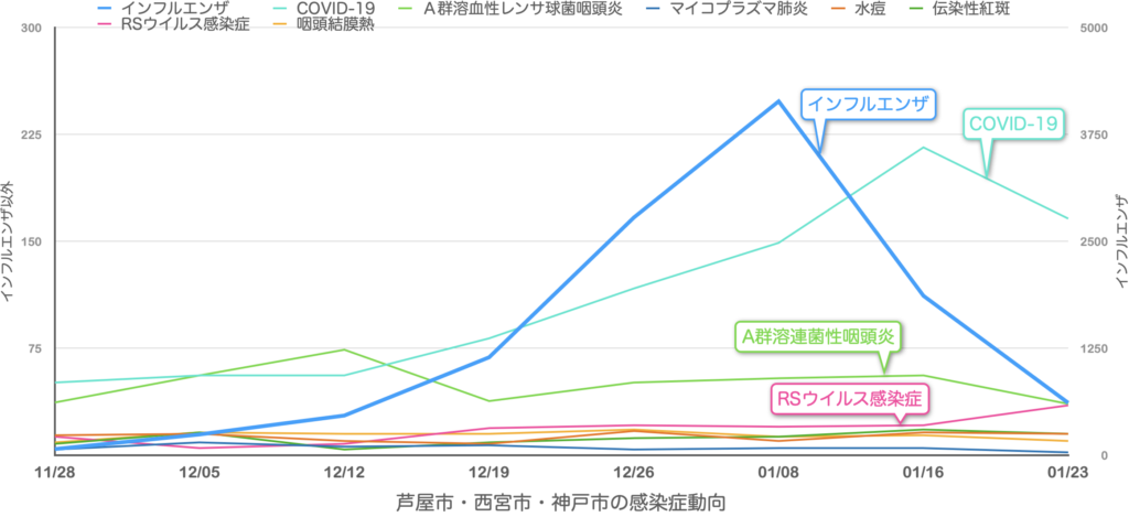 兵庫県感染症情報センターからリリースされている週報から芦屋市・西宮市・神戸市の情報をピックアップして集計したものを若干のコメントをつけて配信しています。
