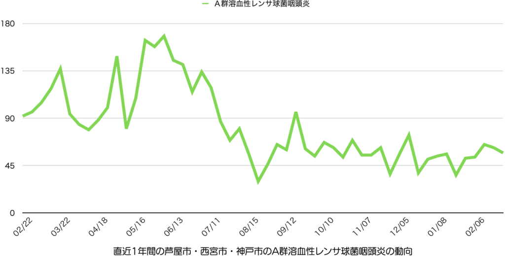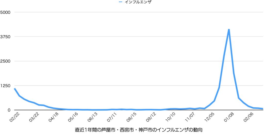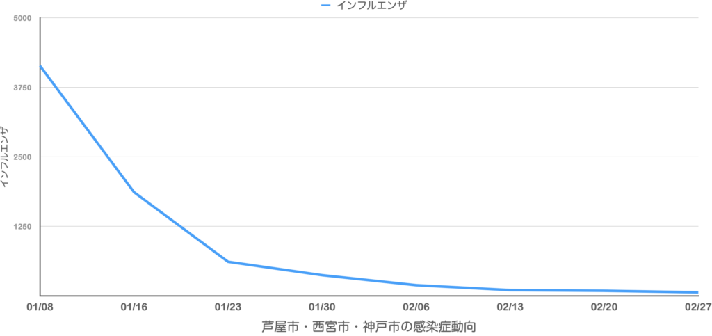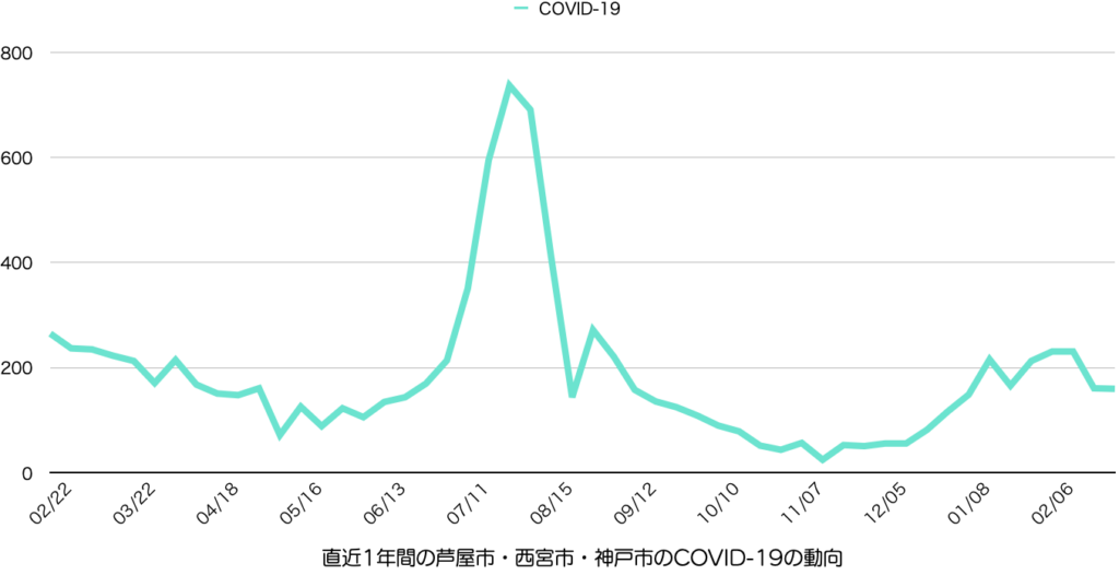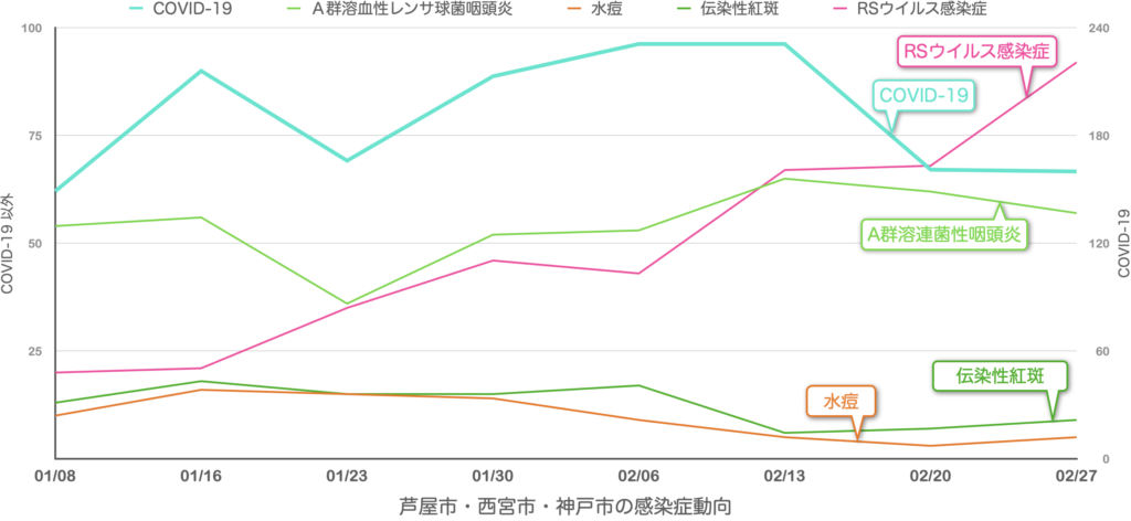 兵庫県感染症情報センターからリリースされている週報から芦屋市・西宮市・神戸市の情報をピックアップして集計したものを若干のコメントをつけて配信しています。