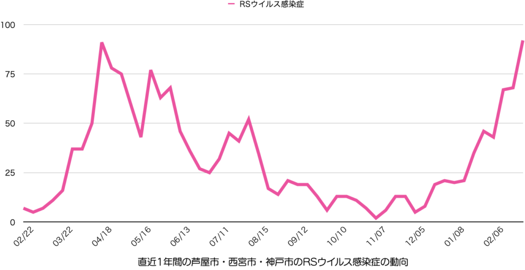 RSウイルス感染症の増加トレンドで、1年前の流行に比肩する状況です。