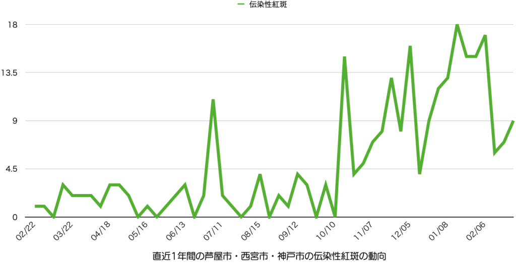 伝染性紅斑は絶対数が多くはなく、グラフ上はダイナミックに増減を繰り返していますが、トレンドとしては横ばいと見るのが妥当なようです。