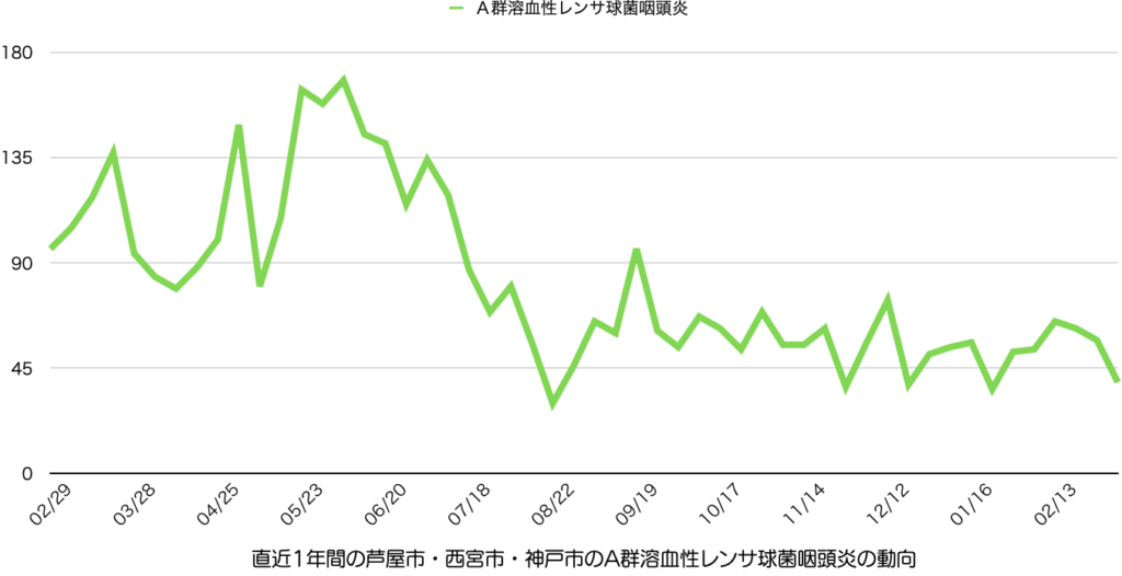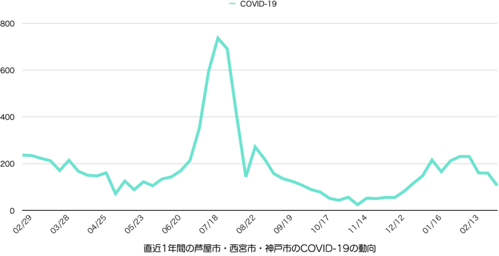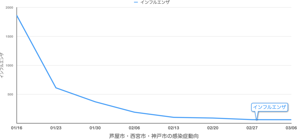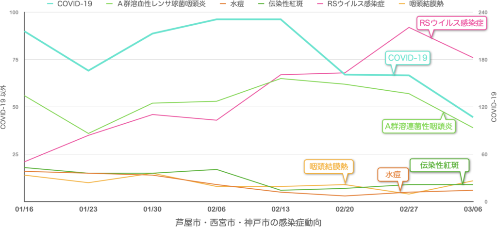 兵庫県感染症情報センターからリリースされている週報から芦屋市・西宮市・神戸市の情報をピックアップして集計したものを若干のコメントをつけて配信しています。