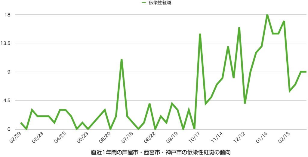 伝染性紅斑は絶対数が多くはなく、グラフ上はダイナミックに増減を繰り返していますが、トレンドとしては横ばいと見るのが妥当なようです。