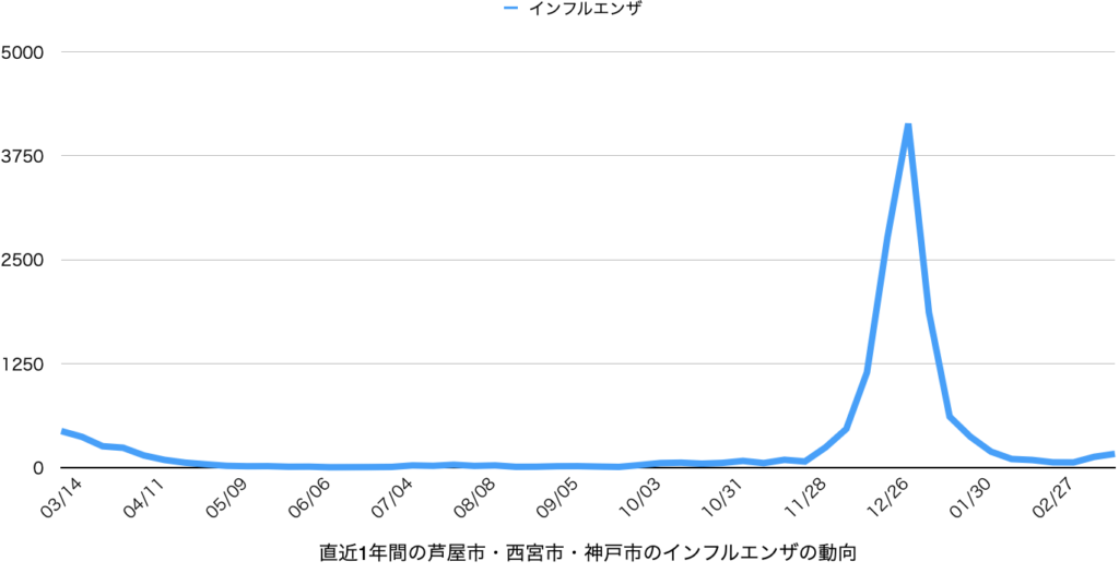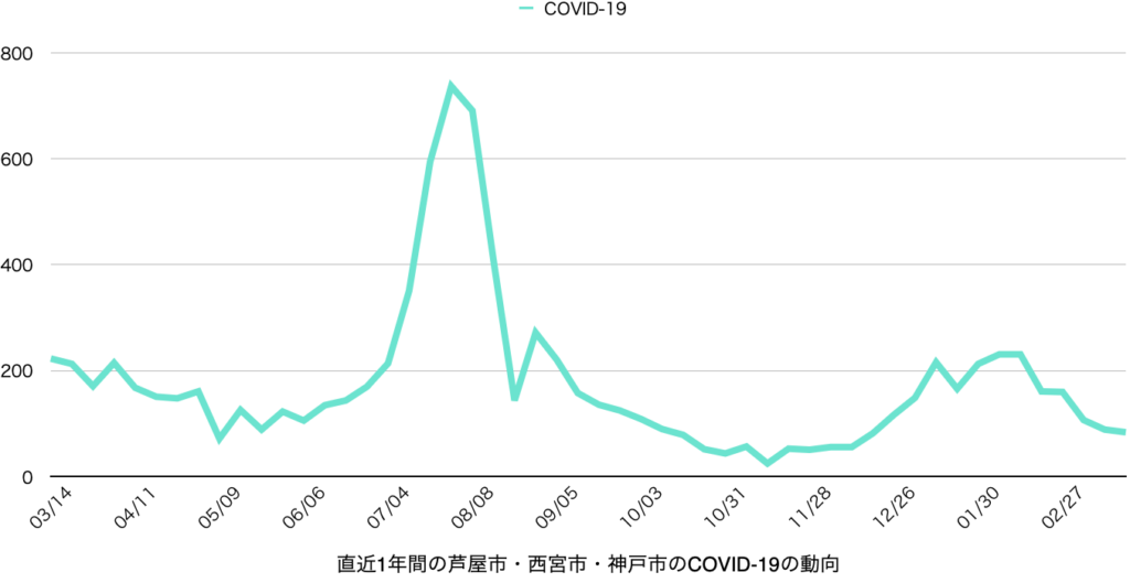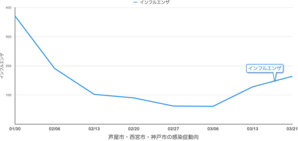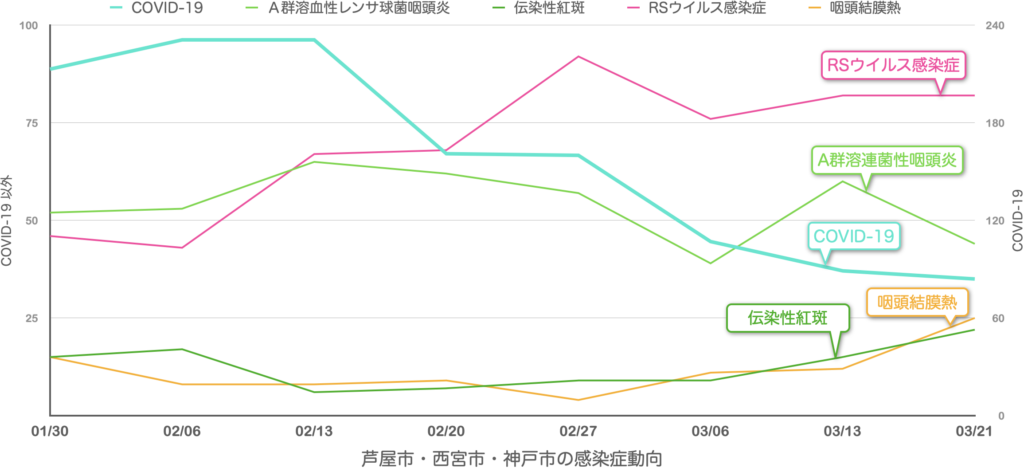 兵庫県感染症情報センターからリリースされている週報から芦屋市・西宮市・神戸市の情報をピックアップして集計したものを若干のコメントをつけて配信しています。