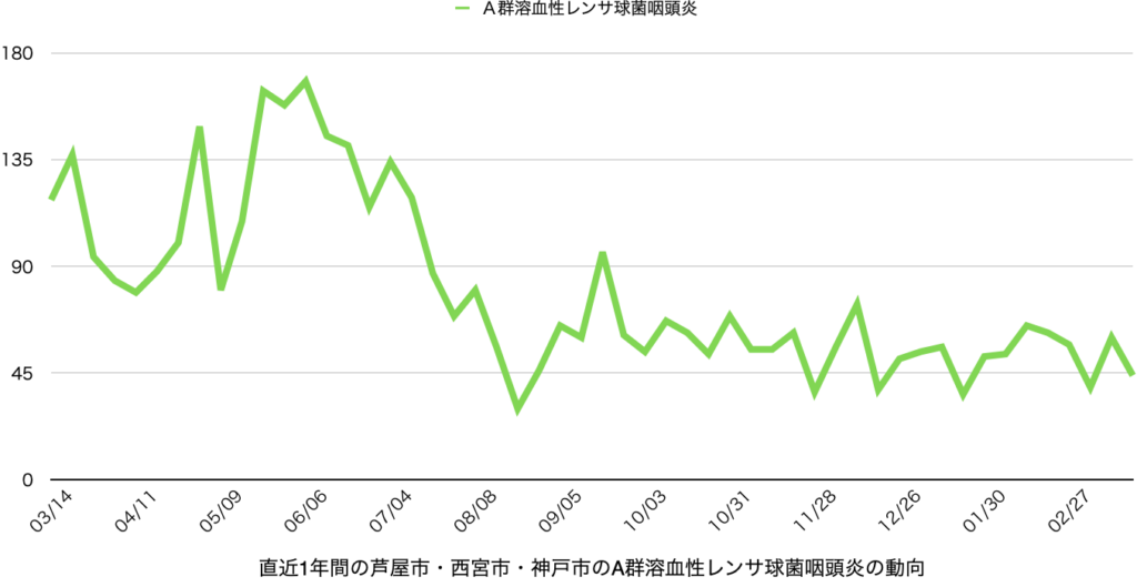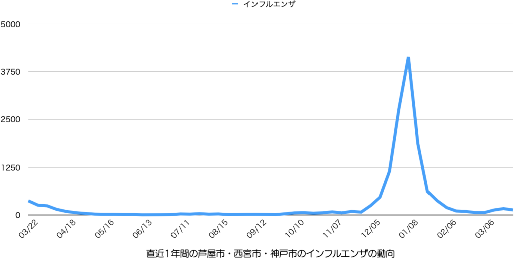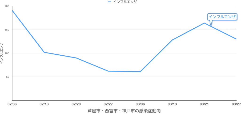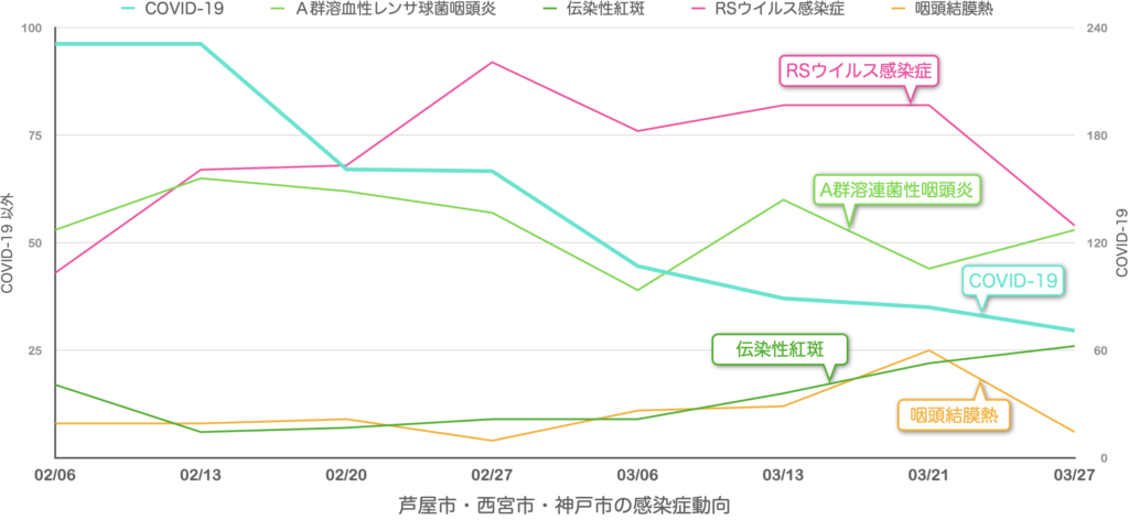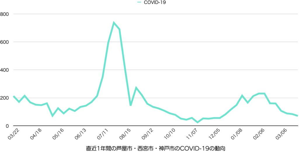 兵庫県感染症情報センターからリリースされている週報から芦屋市・西宮市・神戸市の情報をピックアップして集計したものを若干のコメントをつけて配信しています。