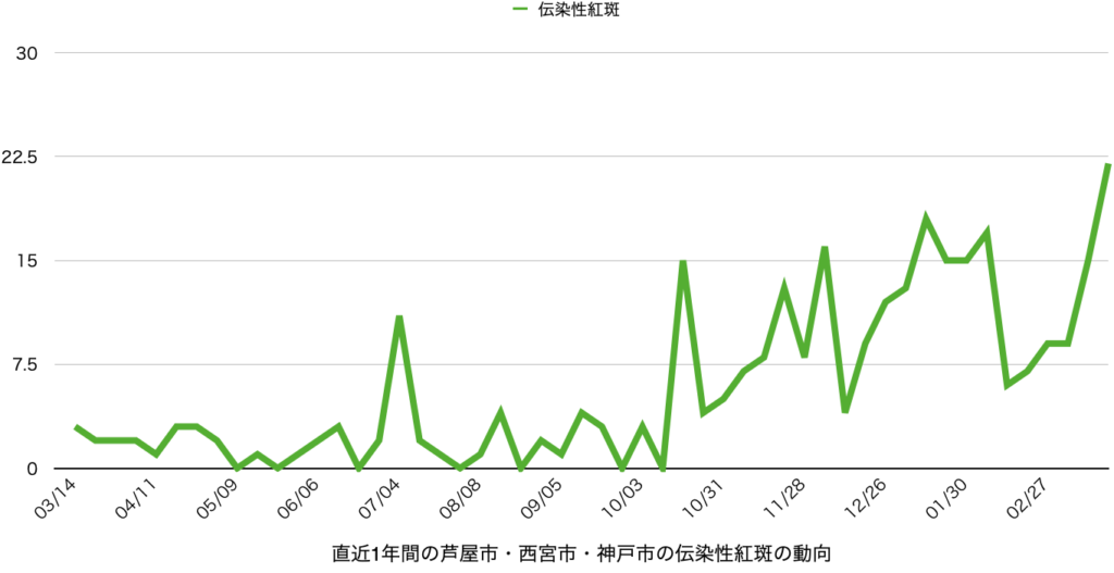 伝染性紅斑は絶対数が多くはなく、グラフ上はダイナミックに増減を繰り返しています。