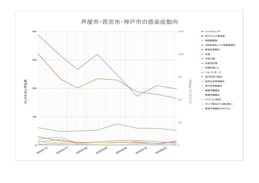 兵庫県感染症情報センターからリリースされている週報から芦屋市・西宮市・神戸市の情報をピックアップして集計したものです。