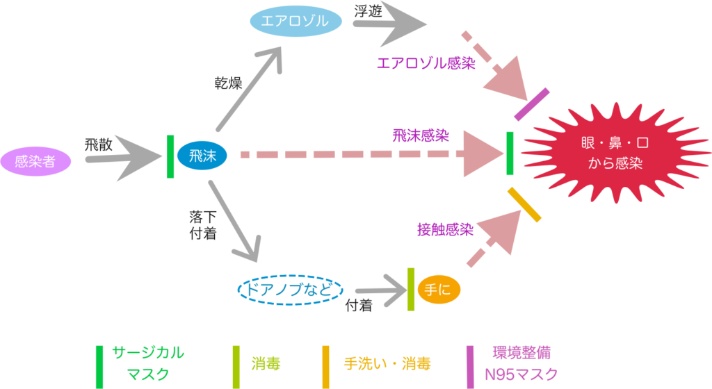 マスク着用・手洗い・手指消毒・環境消毒は周知の対策ですが、それぞれ感染ルートのどこに有用なのでしょうか。