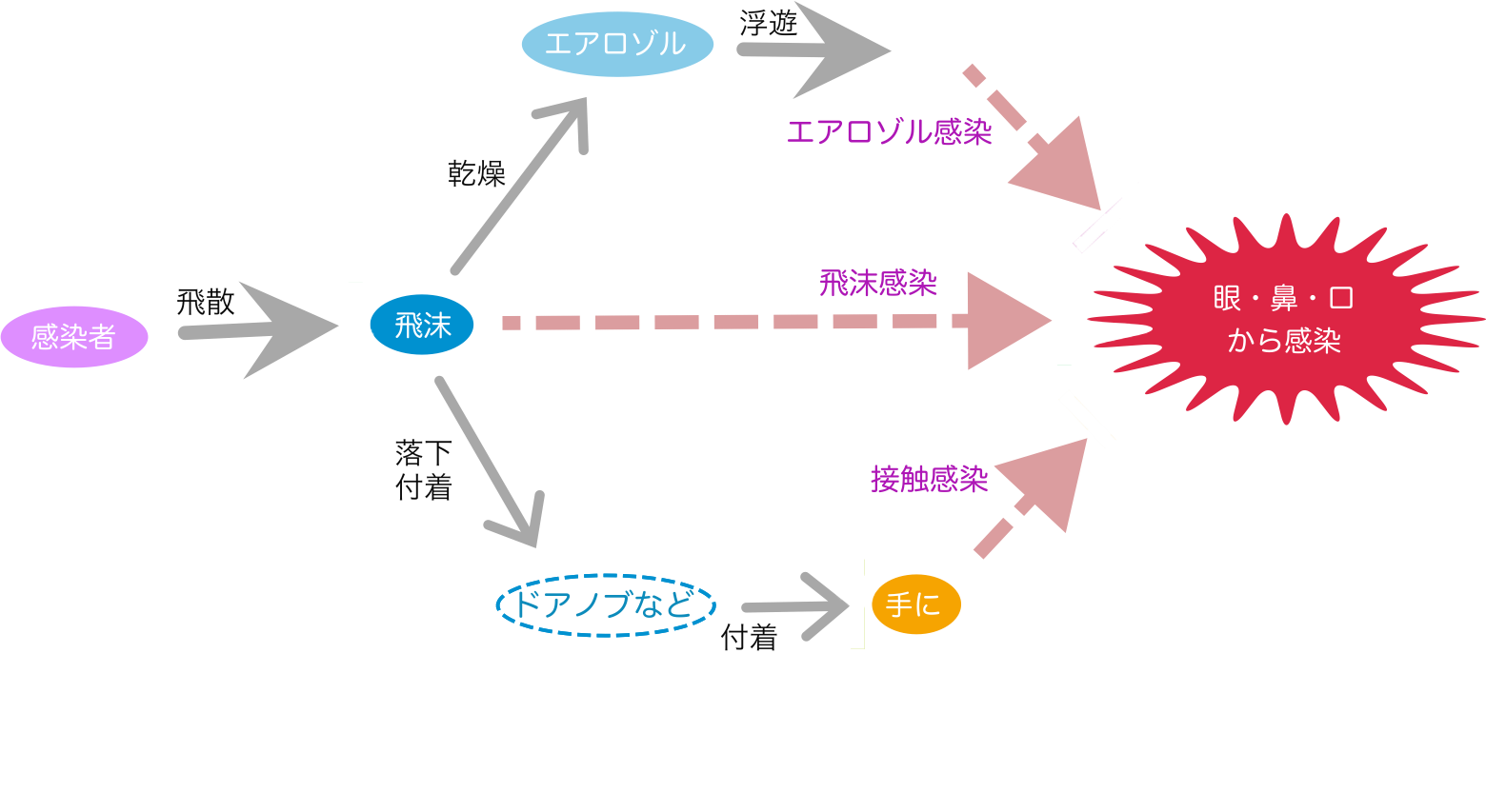 エアロゾルとは非常に小さな飛沫のことで、感染者から飛散した後に飛沫が蒸散(乾燥)してエアロゾル化したり、落下して付着した飛沫が蒸散してエアロゾル化したりします。飛沫同様にこれを吸引すると感染します。