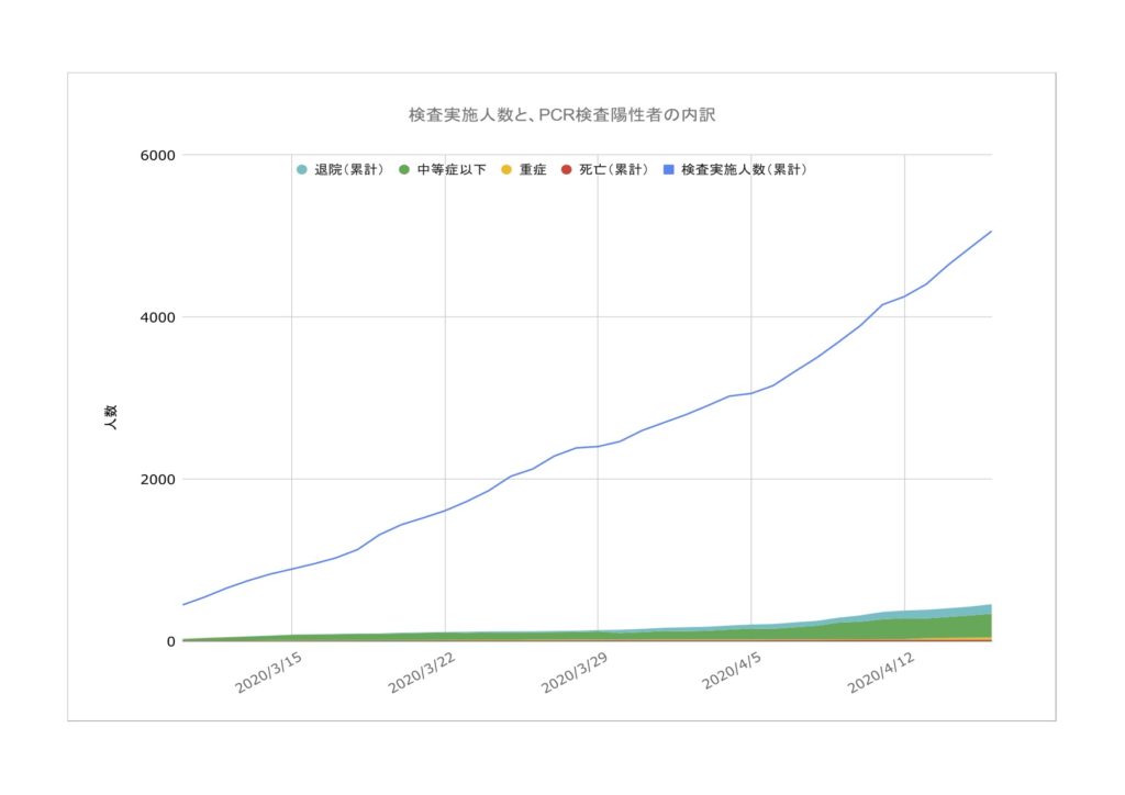 このグラフは兵庫県で実施されたPCR検査の累計と、陽性者の病状の内訳です。
