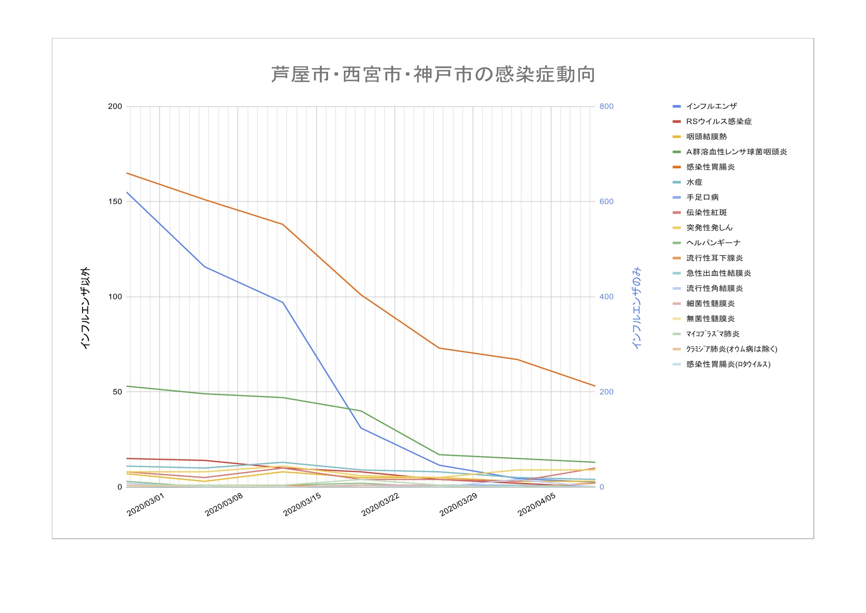 兵庫県感染症情報センターからリリースされている週報から芦屋市・西宮市・神戸市の情報をピックアップして集計したものです。