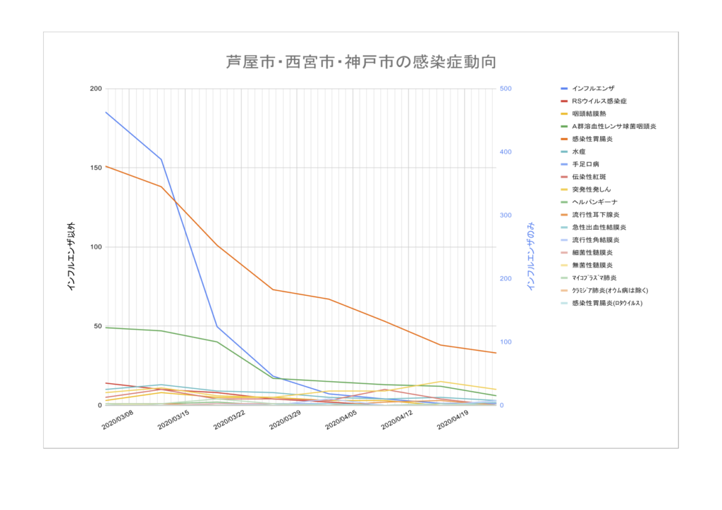 兵庫県感染症情報センターからリリースされている週報から芦屋市・西宮市・神戸市の情報をピックアップして集計したものと、兵庫県のCOVID-19関連のデータを集計したものを配信しています。