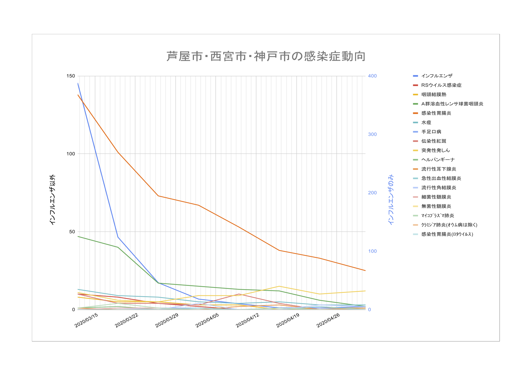 兵庫県感染症情報センターからリリースされている週報から芦屋市・西宮市・神戸市の情報をピックアップして集計したものと、兵庫県のCOVID-19関連のデータを集計したものを配信しています。