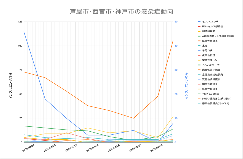 まず感染性胃腸炎が急激に上昇傾向に転じています。本症は兎にも角にも手洗いが有効な感染症です。今回のCOVID-19で手洗いの習慣が身につかれた方も多いと思いますので、ぜひ今後も続けて頂ければと思います。