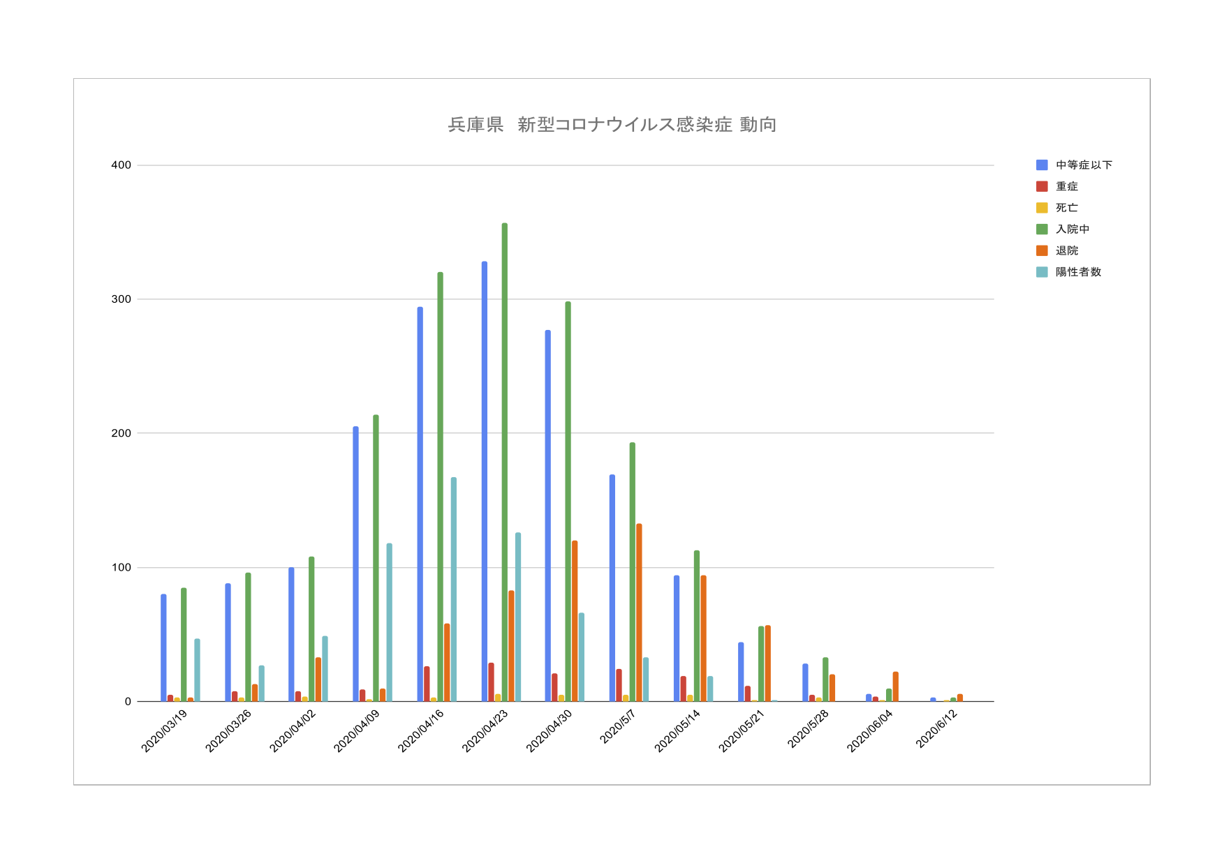 兵庫県の集計では5/16以降PCR陽性者はゼロが続いています。そのため基本的に陽性なった方々が軽快して中等症以下・重症とも順調に減少傾向です。