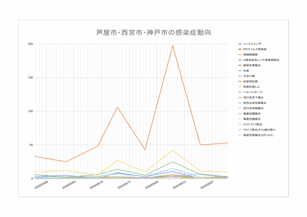兵庫県感染症情報センターからリリースされている週報から芦屋市・西宮市・神戸市の情報をピックアップして集計したものと、兵庫県のCOVID-19関連のデータを集計したものを配信しています。