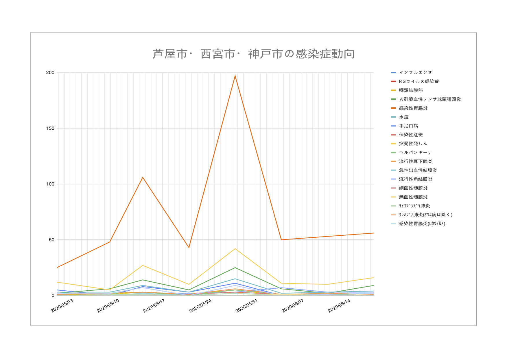 兵庫県感染症情報センターからリリースされている週報から芦屋市・西宮市・神戸市の情報をピックアップして集計したものと、兵庫県のCOVID-19関連のデータを集計したものを配信しています。