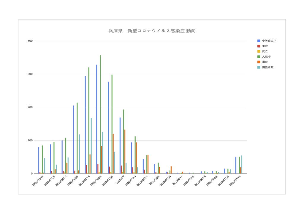 東京・大阪等の大都市での陽性者数が日々ニュースで報じられ、彼の地が増加フェーズであることに疑いはありません。兵庫県の現状はどうでしょうか。