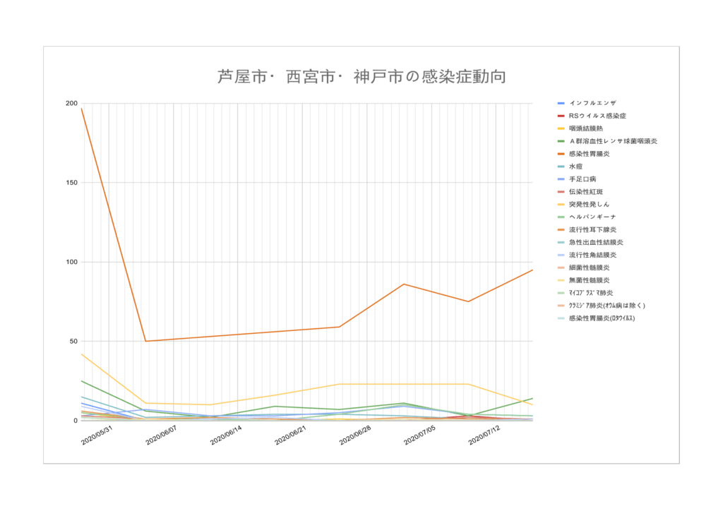 兵庫県感染症情報センターからリリースされている週報から芦屋市・西宮市・神戸市の情報をピックアップして集計したものと、兵庫県のCOVID-19関連のデータを集計したものを配信しています。