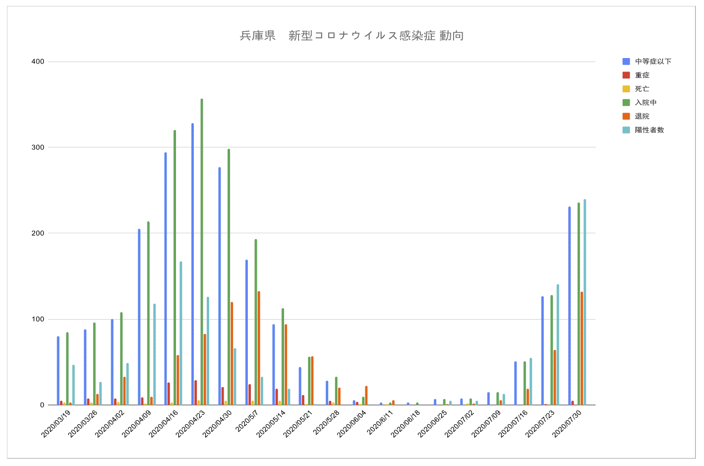 最近テレビを見ていたら「第2波」という言葉が出始めているようです。明確に増加フェーズの現状はその言葉のとおりとも言えますが、兵庫県の現状はどうでしょうか。
