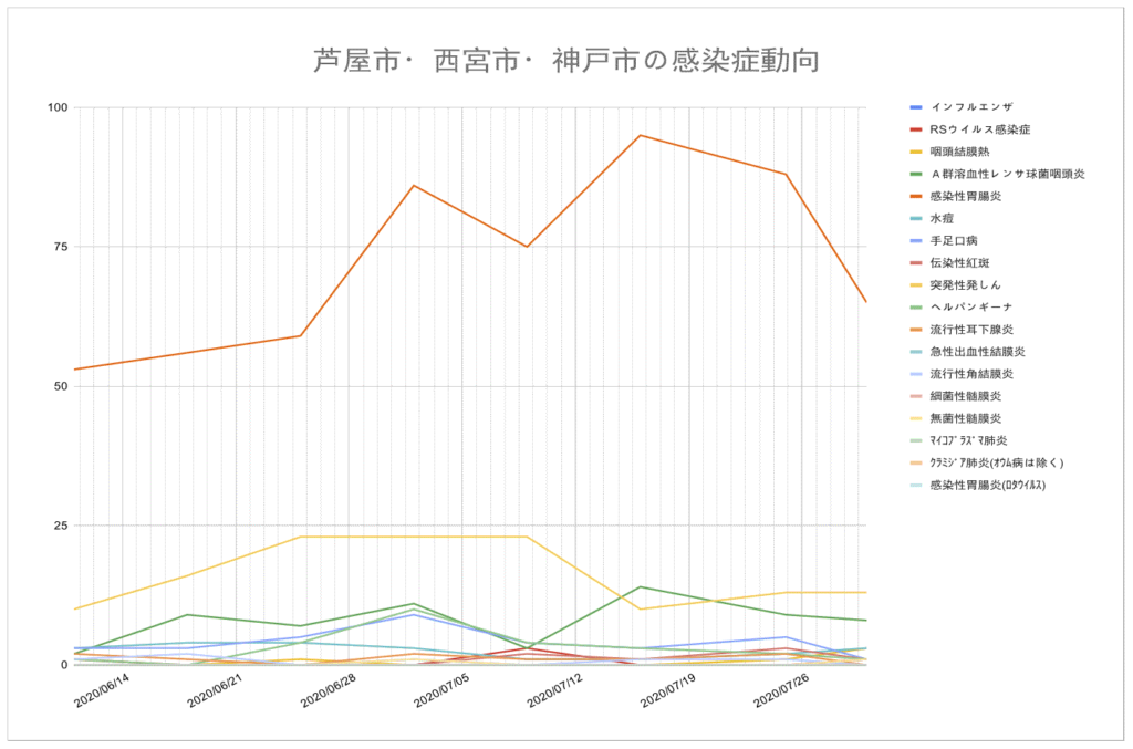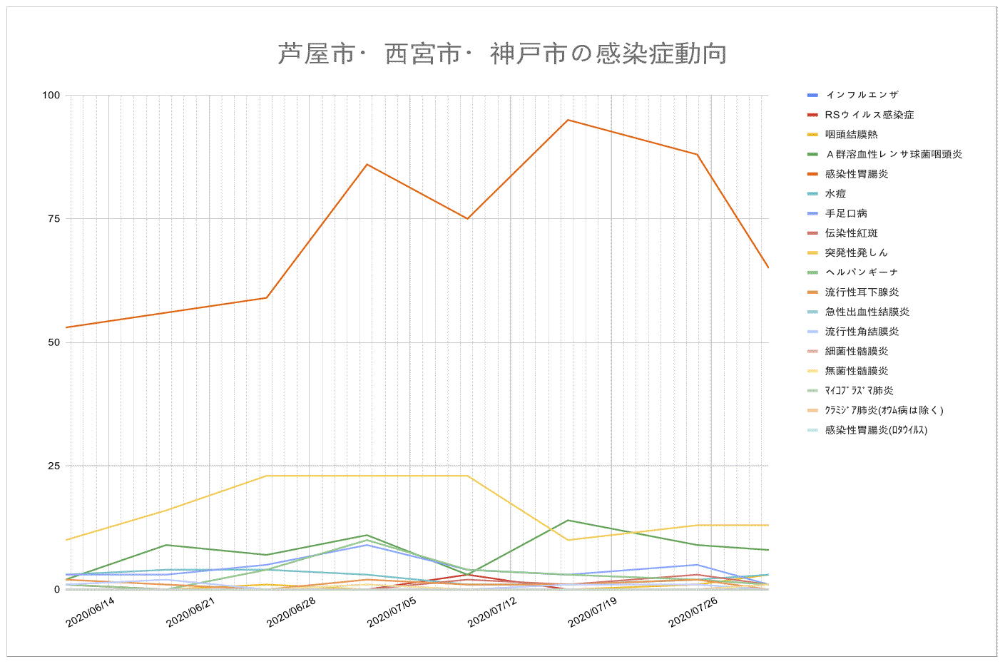 兵庫県感染症情報センターからリリースされている週報から芦屋市・西宮市・神戸市の情報をピックアップして集計したものと、兵庫県のCOVID-19関連のデータを集計したものを配信しています。