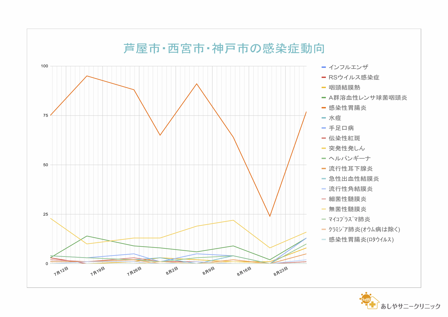 先週の報告ではいずれの感染症も横ばい〜減少傾向で「お盆休みに伴う医療機関等の稼働状況の影響を受けている可能性があります」と記載しましたが、今週はいずれの感染症もほぼ先々週と同程度のレベルに戻りました。