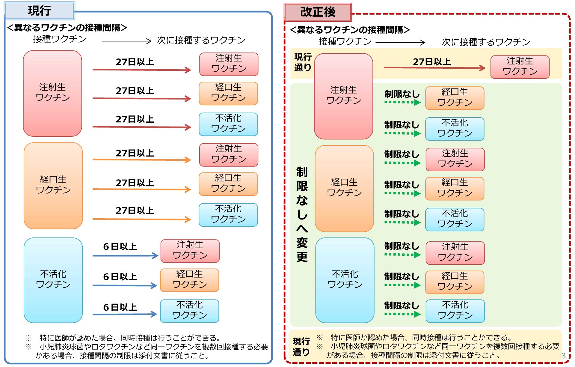 なお、今回のルール改正で生ワクチンはさらに注射生ワクチンと経口生ワクチンに分類されています。