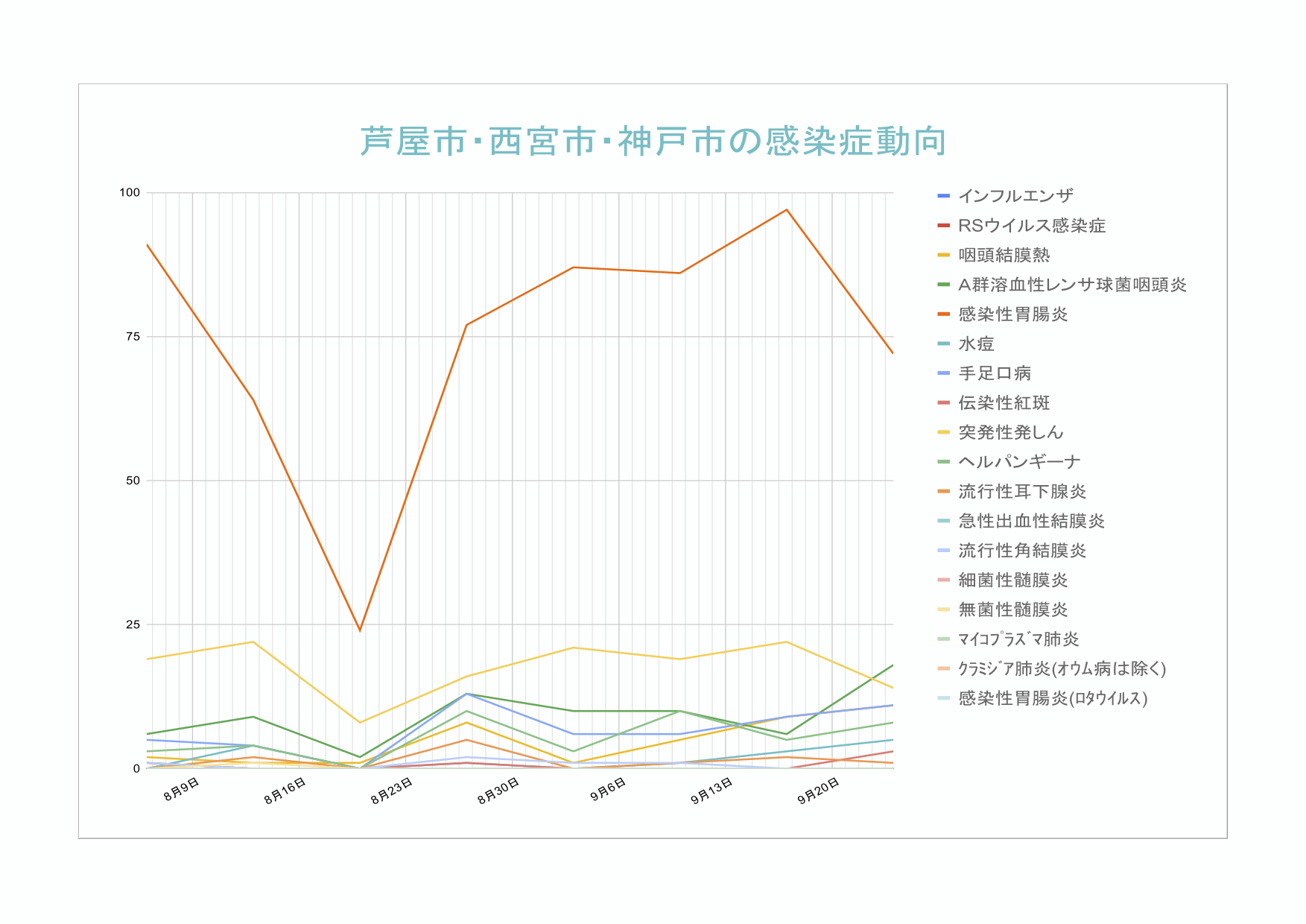 突発性発疹が減少に転じ、溶連菌性咽頭炎が上昇傾向です。高熱を伴う喉の痛みに注意が必要です。