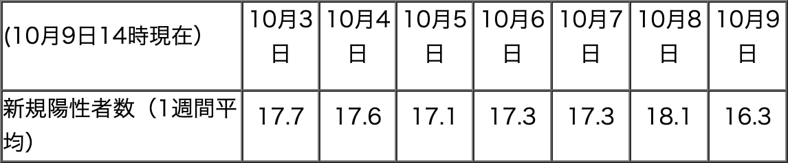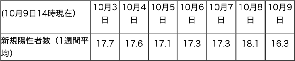 PCR検査の新規陽性者数は9/28以降の上昇傾向から概ね17名台で推移中です。