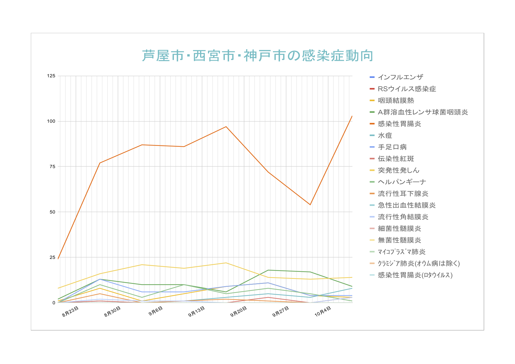 溶連菌性咽頭炎はやや高めで推移中でしたが大きく上昇することなく推移中です。
