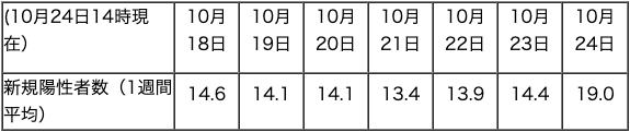 PCR検査の新規陽性者数は先週までの15名前後から14名前後で推移していましたが、直近の10/24は19.0になりました。