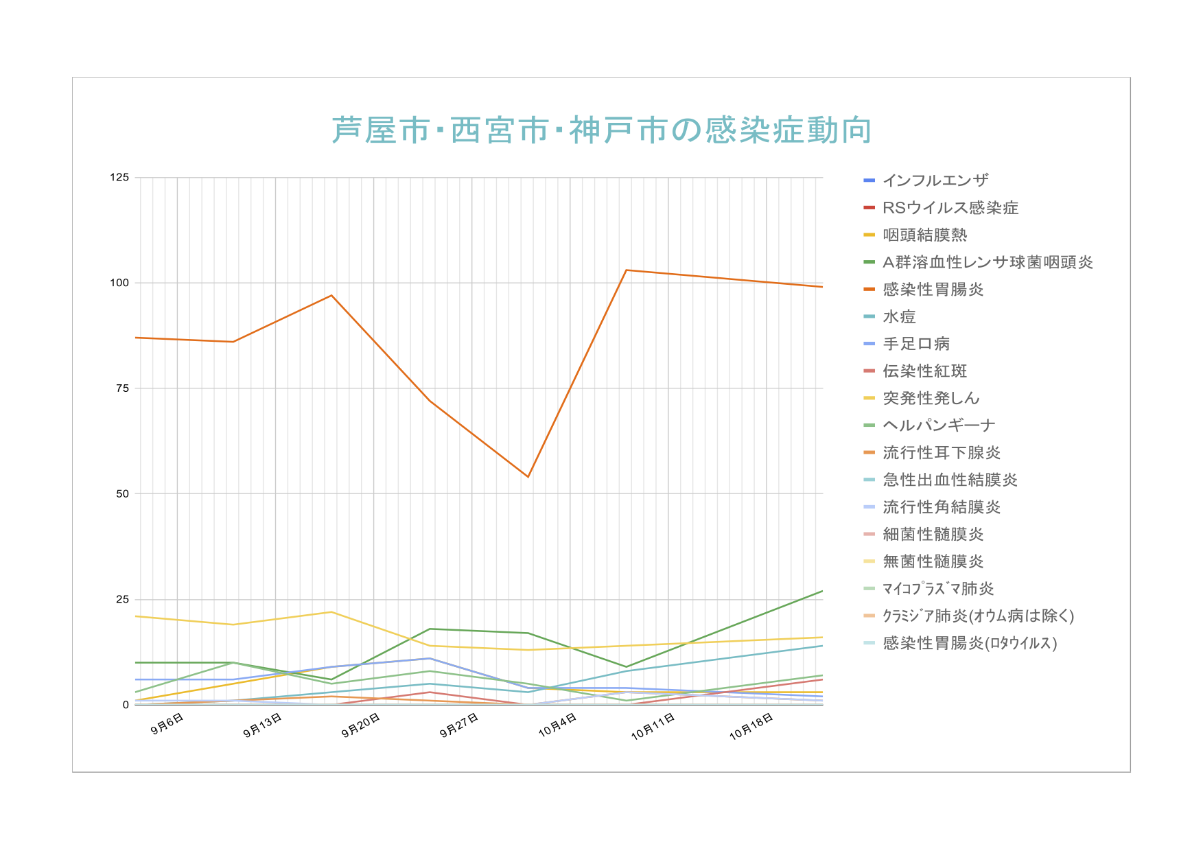 大きな動きはありませんが、水痘(みずぼうそう)の増加傾向が続いているのと、溶連菌性咽頭炎も徐々に増えてきています。