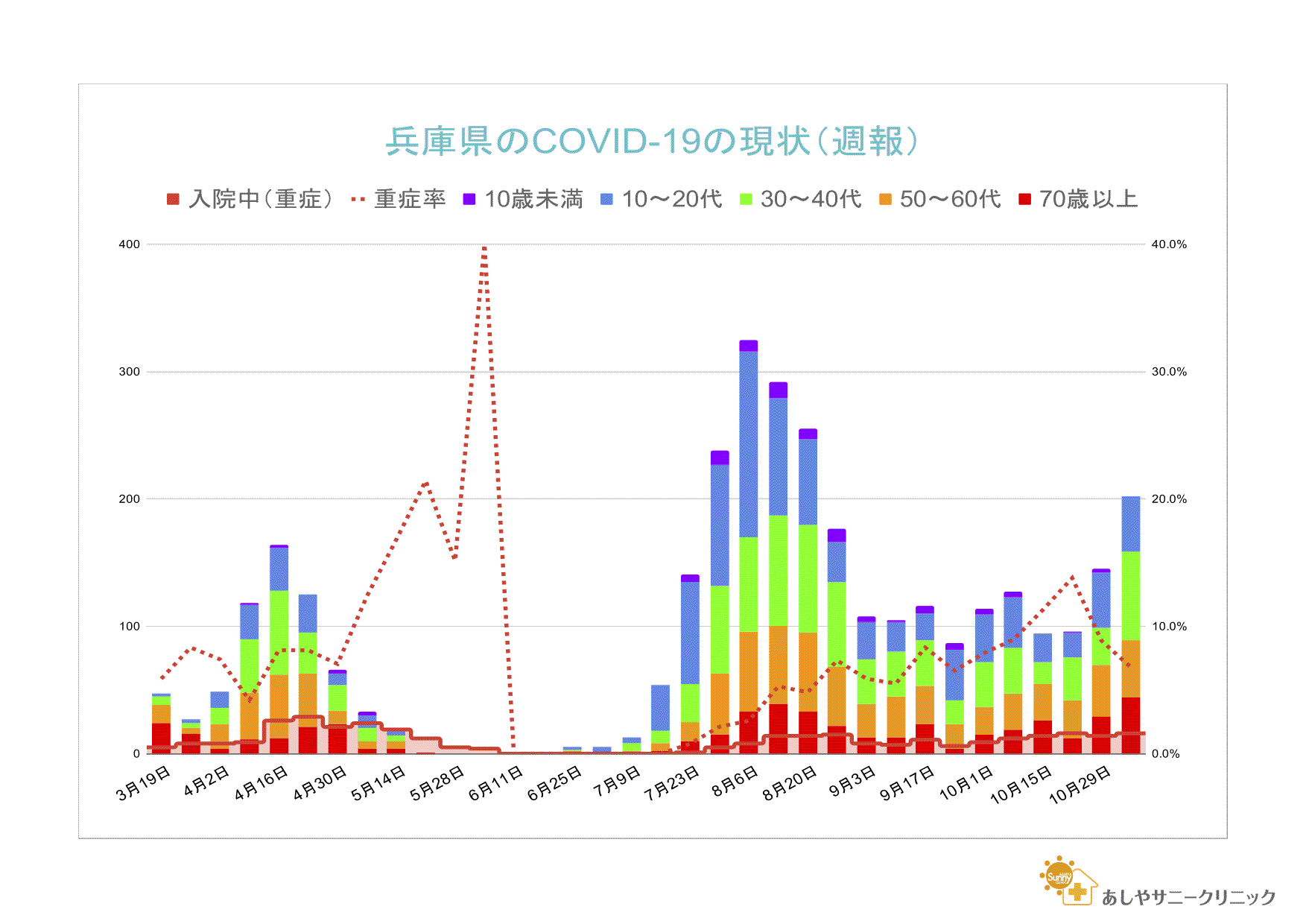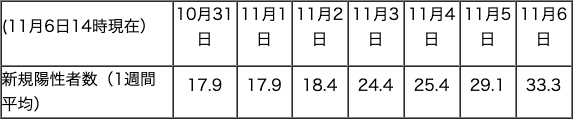 PCR検査の新規陽性者数は今週半ばから急増し、本日11/6に30を超えて「感染拡大期Ⅰ」になりました。