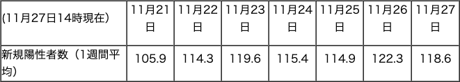 PCR検査の新規陽性者数(1週間平均)は11/20に「感染拡大特別期」になり、その後も新規陽性者数は100人/週以上で推移中です。
