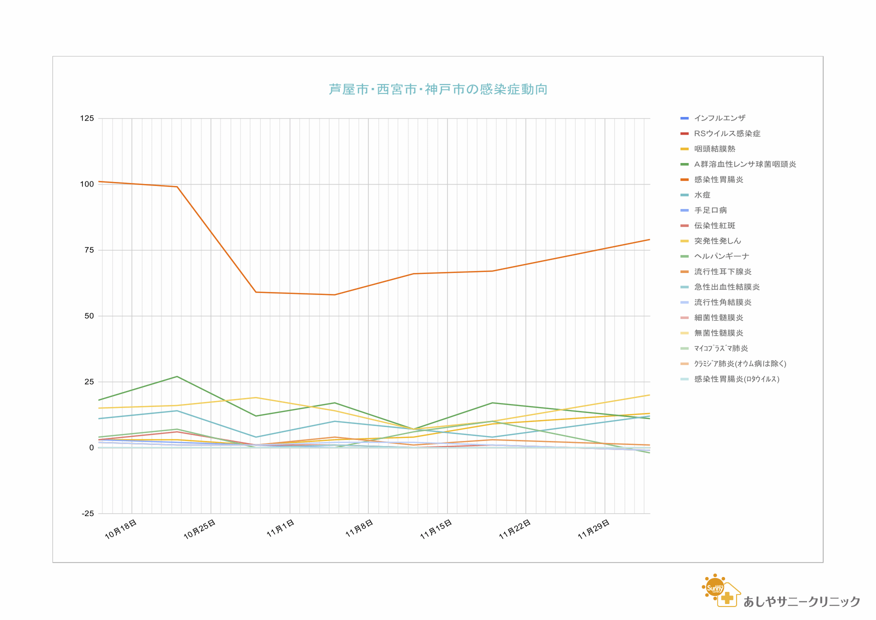 急性胃腸炎の漸増傾向が続いている他は目立った動きはありません。非常に落ち着いた状況です。