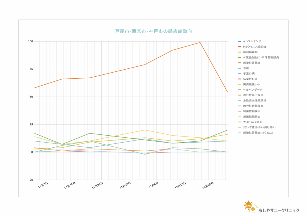 最近の急性胃腸炎の増加傾向は全国的でしたが、今週は激減しました。咽頭結膜熱(プール熱)の微増傾向が続いています。なお、インフルエンザは兵庫県全体で1例の報告にとどまっています。