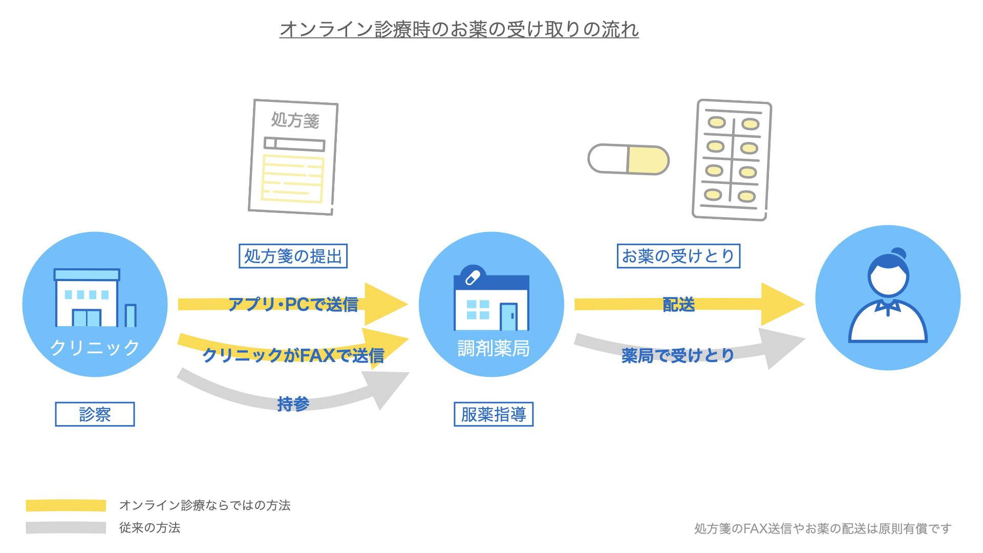 お薬の配送サービスを利用することで受診からお薬の受けとりまでの全てがオンラインで完結します