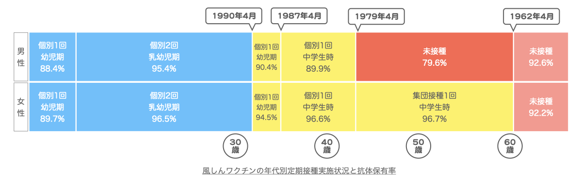 上図は風疹ワクチンの年代別定期接種実施状況と、抗体保有率を示したものです。