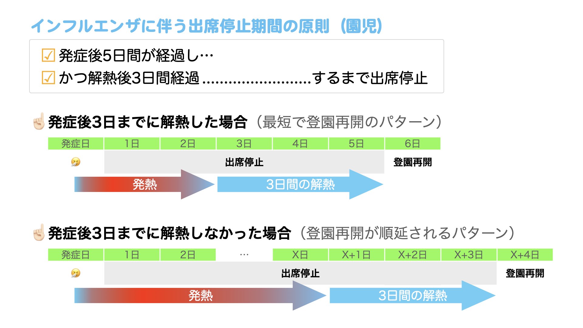 インフルエンザは学校保健安全法によって下記のように出席停止期間が定められています(登園停止・登校停止)。